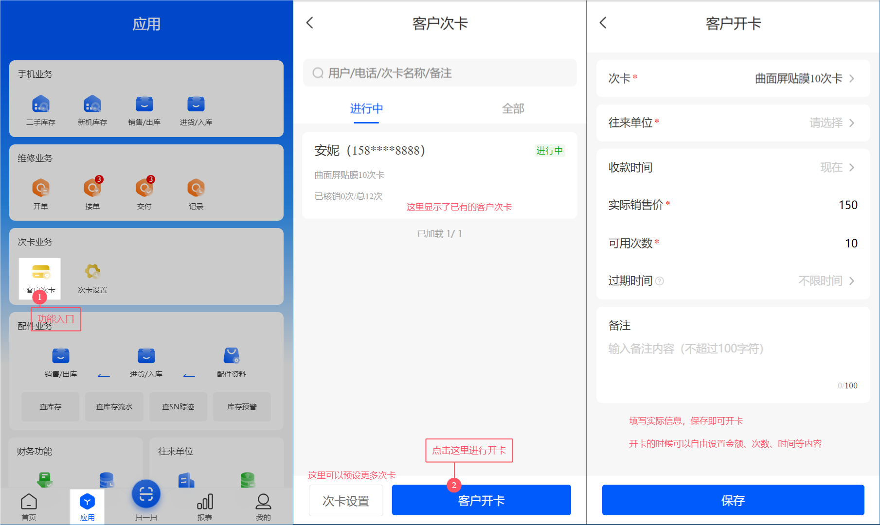 - 功能描述:当客户上门时,用户可以为客户开通次卡,选择适合的次卡类型、设置有效期等信息。