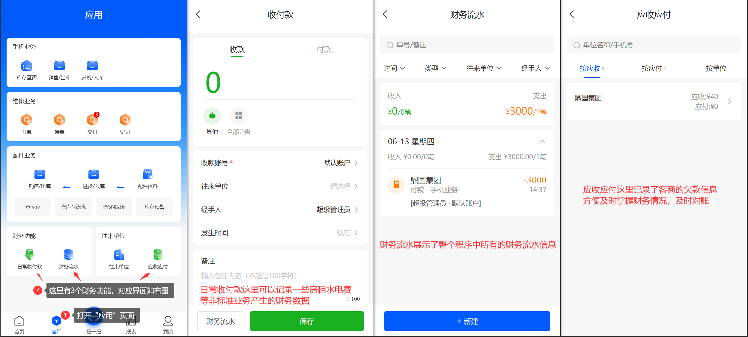 - 日常收付款: 涵盖非例行业务产生的财务活动,确保财务管理的全面性,提交后系统自动生成相应的财务流水,并更新账户余额,更新往来单位的财务统计数据。